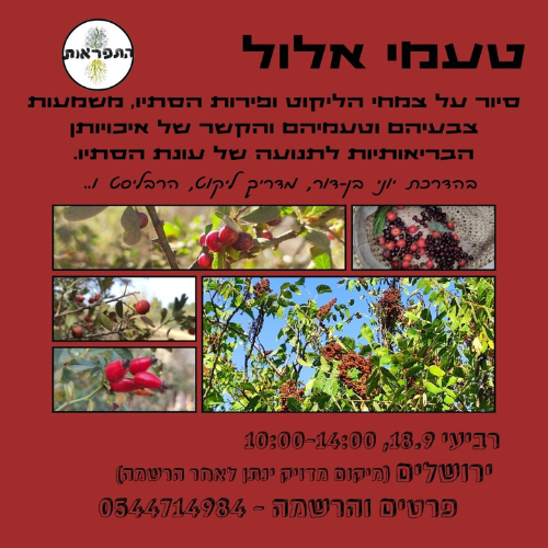 סיור על צמחי הליקוט ופירות הסתיו, משמעות צבעיהם וטעמיהם והקשר של איכויותן הבריאותיות לתנועה של עונת הסתיו. הבהרה: "על עלים" אינה אחראית בשום אופן לתכני