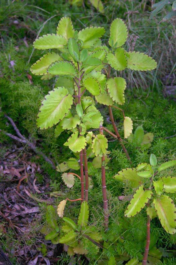 תאור בוטני: לסוג Kalanchoeמשתייכים כ-200 מינים הגדלים באפריקה, מדגסקר, סין ויאוה. המין K. pinnatum הוא היחידי הגדל בדרום אמריקה. זהו צמח בשרני רב שנתי המגיע לגובה 1-1.5 מ'. הגבעולים חלולים, העלים בשרניים וצבעם ירוק כהה. הפרחים בצבע לבן, ניראים כפעמונים תלויים.