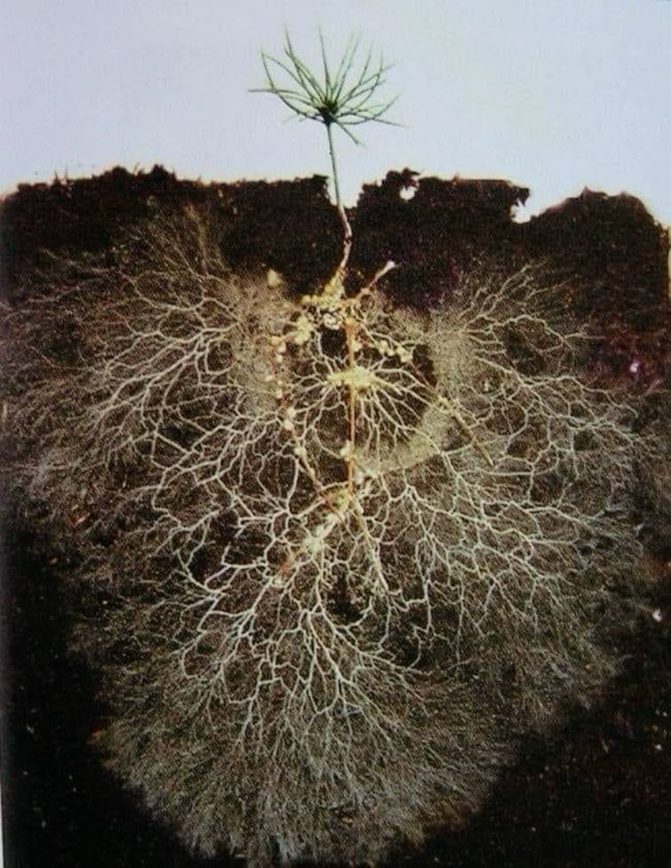מתחת לפני השטח, מסתבכים בין שורשי הצמחים תפטירים (מיצליום) של פטריות, המחברים ביחד את הצמחים לרשת המאפשרת להם לתקשר ביניהם, להעביר מזון , לעזור ואפילו להזיק זה לזה.